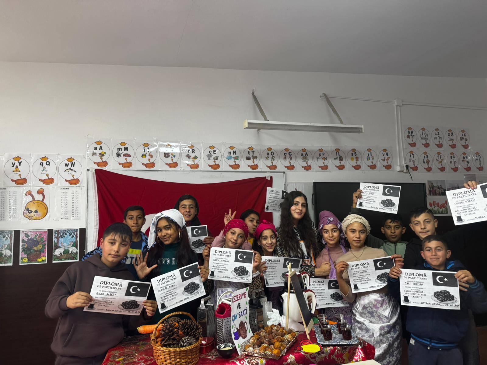 În cadrul atelierului, elevii au descoperit gusturi tradiționale din cultura turcă, pregătind împreună ceai turcesc și cezerye, un desert sănătos din morcovi, biscuiți și nuci. Au decorat standul cu mult entuziasm și creativitate, iar atmosfera a fost una plină de culoare, arome și zâmbete.